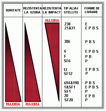 In productia curenta a firmei DELORO STELLITE sunt peste 20 de tipuri de aliaje tip STELLITE, un tabel sugestiv al proprietatilor acestora fiind prezentat in cele ce urmeaza: